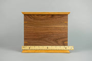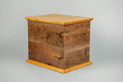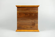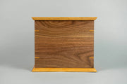 Honor the memory of your loved one with the Craftsman Walnut and Cherry Wood Cremation Urn, a beautifully crafted tribute that showcases the natural elegance of locally sourced lumber. Designed with meticulous attention to detail, this urn features a harmonious blend of cherry and walnut woods, accented with classic craftsmanship elements such as corner keys and an ogee edge on the top and bottom. Finished with natural Rubio Monocoat oil. Opens from the bottom with screws. Includes 2 black plastic liners.