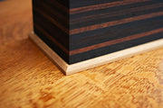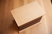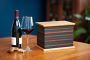 This cremation urn is perfect for wine and whiskey lovers. When the American wineries and whiskey distilleries are finished with white oak barrels, we reclaim this wood to make beautiful cremation urns colored by the grapes and grain they helped to flavor. Charred oak barrels used to make whiskey create the darkest layers while wine barrels make up the brown and tan layers. The top and bottom are made from white oak with a handsome 45 degree chamfered edge. Urn opens from the bottom with wood screws. Includes a plastic cremation insert (a.k.a. the black box).